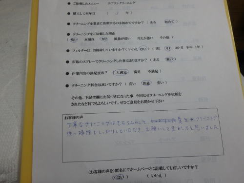 エアコンクリーニング作業を確認して頂いたお客様にアンケートを書いて頂き9割以上のお客様に適正料金と答えてもらえました。