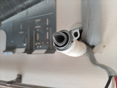年式も古い為、クリーニングはせずにエアコンを取り付ける据付板の角度を調整し応急処置、外のドレンホースからの排水を確認し内機から水漏れはしなかったので作業終了です。