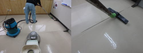 ポリッシャーを使用し植物性洗剤で洗浄 →→ バキュームで回収
